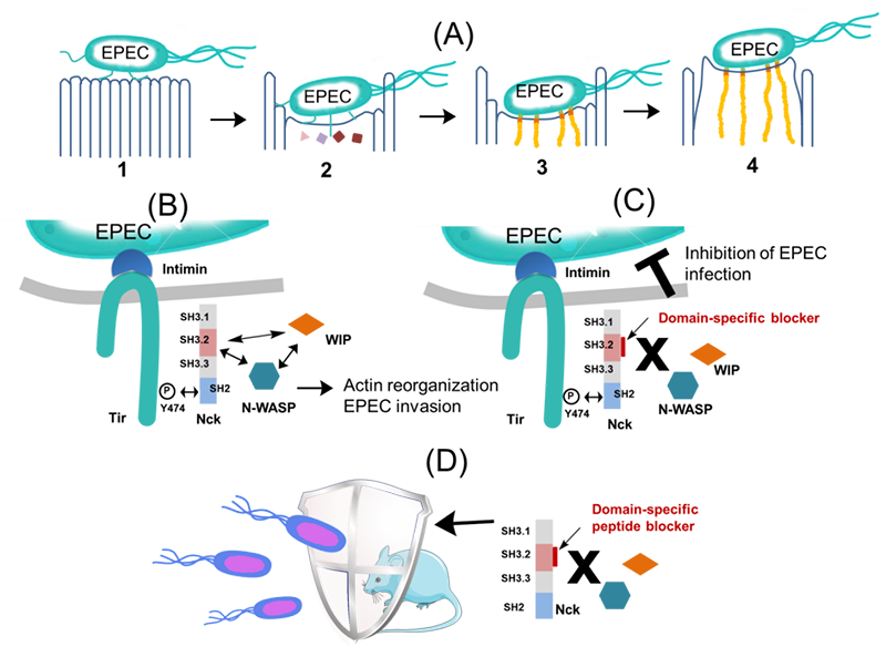 制药与生命科学学院王建浩、蒋鹏举课题组提出一种抗菌新机制——Nck蛋白多肽抑制剂对EPEC引起的肠道细胞损伤的有效防治作用。致病性大肠杆菌(EPEC)在很多地区引起人们腹泻等疾病,目前主要用抗生素治疗,但是耐药性的出现以及新抗生素的缺乏仍是关键问题。经过不断研究发现,联合课题组开发了一种新的抗菌抑制剂P6,通过蛋白之间相互作用达到抑制相关信号通路的传导,最终抑制细菌感染。这种针对宿主细胞的抗菌新机制对细菌感染的预防和治疗具有重要意义,有望成为解决抗药性的有效方法。该工作已申请发明专利,并已与相关企业开展洽谈合作。该工作与香港中文大学夏江课题组和山东大学李永强课题组合作完成,王建浩、蒋鹏举教授共同指导的16级硕士生赵远为论文共同第一作者,王建浩教授为论文第一通讯作者。相关成果近期在线发表于美国国家科学院院刊《PNAS》,该篇论文的发表标志着我校科研团队在抗菌领域的相关前沿性研究工作受到了国际同行的认可和广泛关注。
