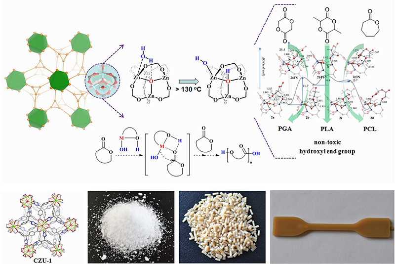 石油化工学院陈群研究员课题组在新型医用可降解聚酯材料及产业化关键技术研发过程中,创新性提出了布朗斯特酸和路易斯酸协同催化环脂开环聚合机理,为无毒、高效聚合催化剂的设计开发奠定了坚实基础。该工作以金属-有机自组装为策略,构筑了生物相容性金属-有机框架材料,实现了高效催化环脂本体开环聚合。通过理论计算并结合原位漫反射傅立叶变换红外光谱和基质辅助激光解吸电离飞行时间质谱等多种验证手段,提出并验证了基于布朗斯特酸和路易斯酸协同催化的环脂开环聚合机理,为开环聚合反应提供了新思路。研发出的新催化剂不仅符合无毒、高稳定和受控开环聚合的要求,形成的聚酯端羟基便于改性,具有重要的应用价值,成果发表在化学顶级期刊《Chemical Science》最新一期上,并获中国发明专利授权(专利号ZL201510483737.8)。