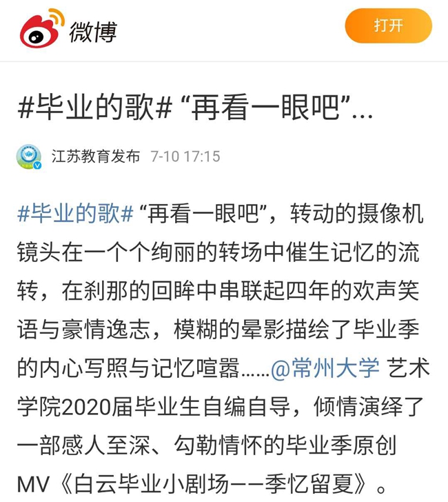 #毕业的歌# “再看一眼吧”,转动的摄像机镜头在一个个绚丽的转场中催生记忆的流转,在刹那的回眸中串联起四年的欢声笑语与豪情逸志,模糊的晕影描绘了毕业季的内心写照与记忆喧嚣……@常州大学 艺术学院2020届毕业生自编自导,倾情演绎了一部感人至深、勾勒情怀的毕业季原创MV《白云毕业小剧场——季忆留夏》。