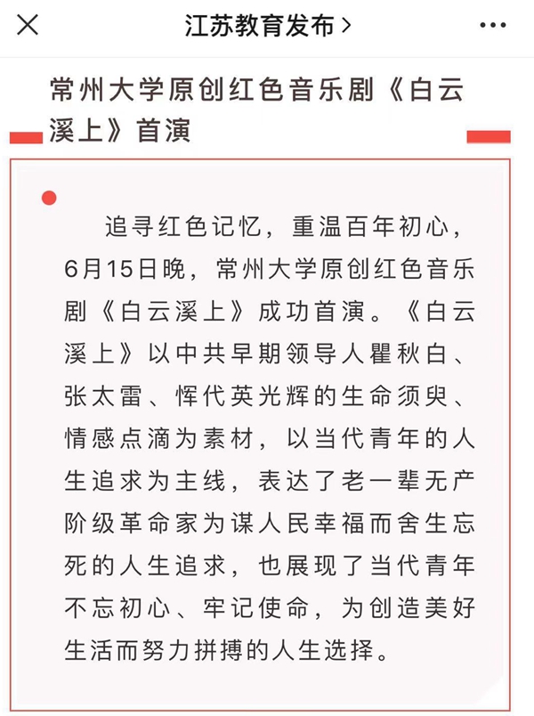 追寻红色记忆,重温百年初心,6月15日晚,常州大学原创红色音乐剧《白云溪上》成功首演。《白云溪上》以中共早期领导人瞿秋白、张太雷、恽代英光辉的生命须臾、情感点滴为素材,以当代青年的人生追求为主线,表达了老一辈无产阶级革命家为谋人民幸福而舍生忘死的人生追求,也展现了当代青年不忘初心、牢记使命,为创造美好生活而努力拼搏的人生选择。