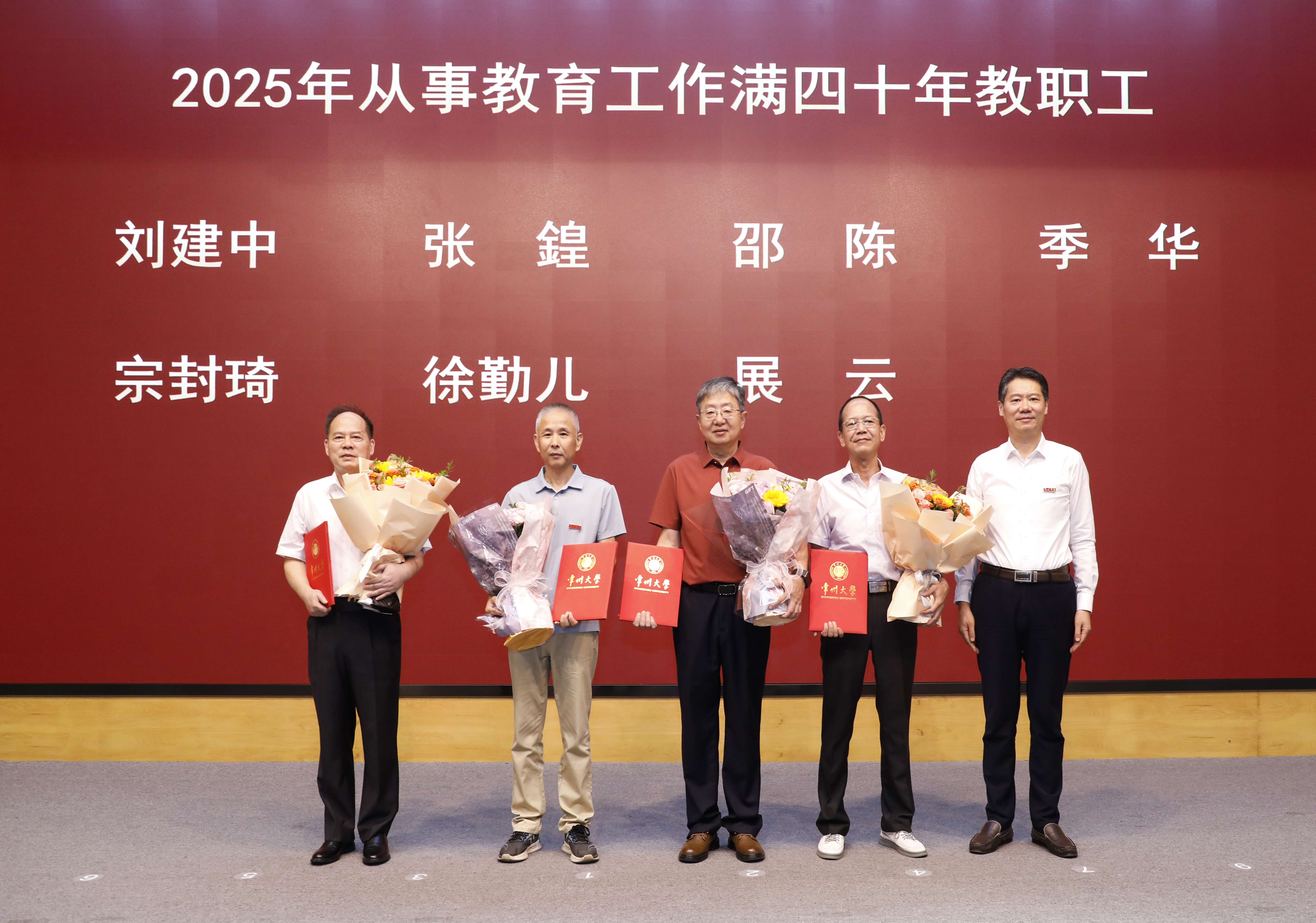 党委常委、宣传部部长薛冰宣读了获得市厅级以上奖励名单和第九届“我最喜爱教师”获奖名单,党委常委、组织部部长秦义宣读了获得2024年度常州大学“勤廉标兵”、“工人先锋号、五一劳动奖章、五一巾帼标兵岗、五一巾帼标兵”表彰决定,副校长晏成林宣读了2025年度常州大学“师德标兵”、“优秀教育工作者”表彰决定,党委常委、副校长周刚宣读了从事教育工作满三十年、四十年的教职工名单。党委副书记、校长陈海群,党委常委、纪委书记、派驻监察专员沈新奎,党委常委、副校长杨琳,党委常委、副校长李忠玉为受表彰的教师颁发证书、献上鲜花。
