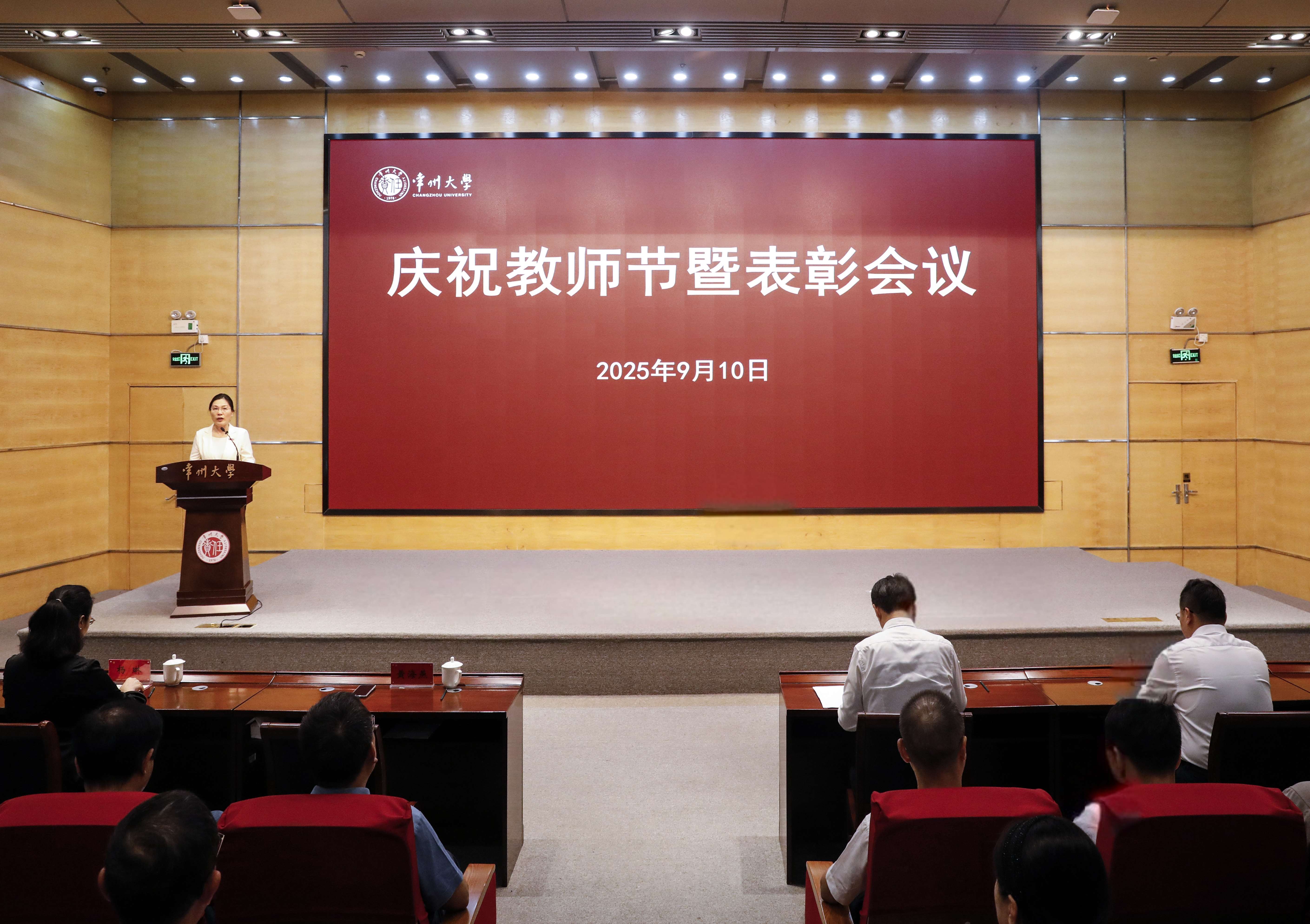 9月10日下午,为庆祝第41个教师节,学校在科教城校区文彰楼报告厅召开庆祝2025年教师节暨表彰会议。会议对2025年获得市厅级以上奖励的集体和个人、第九届“我最喜爱教师”、2024年度常州大学“勤廉标兵”、2024年度常州大学“工人先锋号、五一劳动奖章、五一巾帼标兵岗、五一巾帼标兵”、2025年度常州大学“师德标兵”、2025年度“优秀教育工作者”及从事教育工作满三十年、四十年的教职工进行表彰。党政领导班子成员陈海群、黄海燕、沈新奎、杨琳、李忠玉、周刚、晏成林、秦义、薛冰出席会议。受表彰的先进集体和个人代表,“我最喜爱教师”代表,“勤廉标兵”代表,“工人先锋号、五一劳动奖章、五一巾帼标兵岗、五一巾帼标兵”代表,“师德标兵”代表,“优秀教育工作者”代表,从事教育工作满三十年、四十年的教职工代表,以及相关职能部门负责人和学院师生代表参加会议。党委副书记黄海燕主持会议。