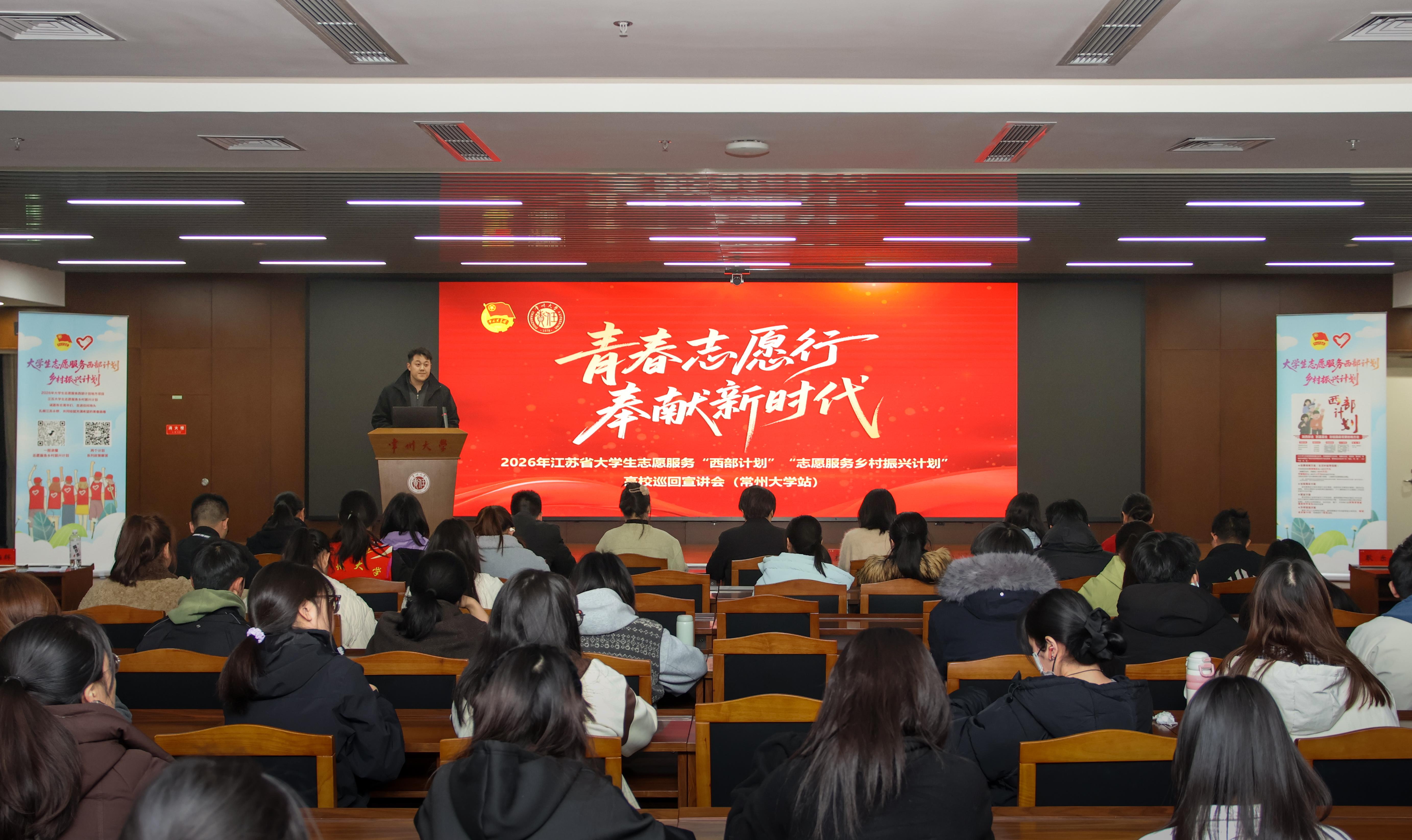 为深入学习贯彻习近平总书记给谢依特小学戍边支教西部计划志愿者服务队全体队员重要回信精神,广泛动员和积极引导优秀高校毕业生铭记殷切嘱托、投身西部基层、奉献青春力量,3月26日,学校举行“青春志愿行  奉献新时代”2026年江苏省大学生志愿服务“西部计划”“志愿服务乡村振兴计划”高校巡回宣讲会。团省委二级巡视员施静芝,团省委社联部(志工部)工作人员蔡雪,武进团区委副书记杨琳,江南大学研究生支教团志愿者广茂池、张佳慧,我校校友、常州市乡村振兴计划志愿者窦心言、耿乐,学生处、团委相关负责人,部分大四毕业生、在读研究生,以及意向报名参加“两个计划”的志愿者代表参加活动。