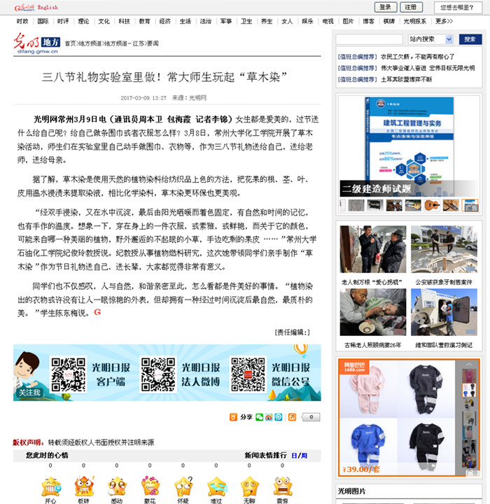 | 光明网:三八节礼物实验室里做!常大师生玩起“草木染” |