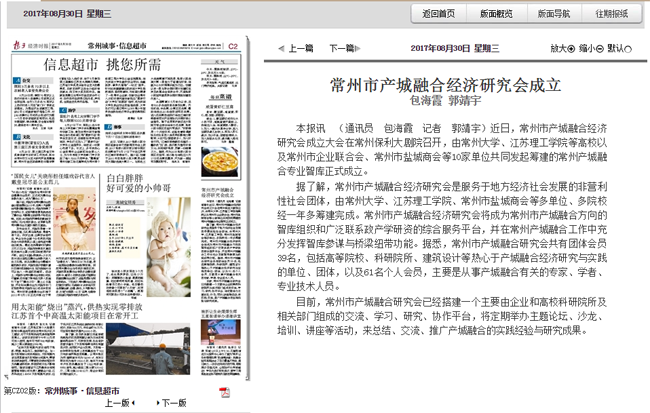 | 扬子晚报:常州市产城融合经济研究会成立 |