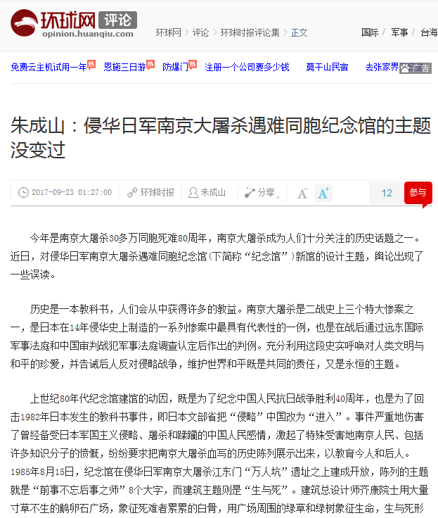 | 环球时报刊登我校马克思主义学院朱成山老师的评论:侵华日军南京大屠杀遇难同胞纪念馆的主题没变过 |