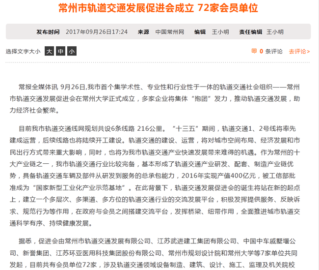 | 中国常州网:常州市轨道交通发展促进会成立 72家会员单位 |