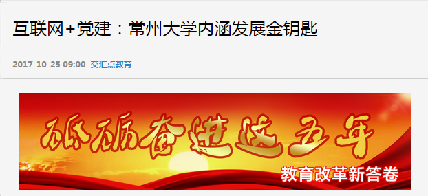 10月25日,新华日报教育版“高校书记笔谈”专栏刊发我校党委书记程纯教授的署名文章“互联网+党建:常州大学内涵发展金钥匙”。文章认为,“互联网+党建”是新时期提升党建科学化水平的必由之路,是促使我们进一步解放思想、开拓视野、解决问题的新钥匙,有助于进一步开创党的建设伟大工程的新局面。文章从“丰富内容:多元多样全程全域”、“坚守旨归:党要管党从严治党”两个方面全面展示了我校互联网+党建工作的实践探索和创新发展。