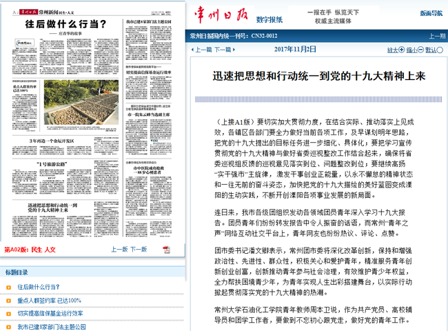 | 芮曼菁 秋冰 黄钰 陶英杰 秦嫣 龚青轩 常州日报 第A01版:要闻 2017.11.2 发布时间: 2017-11-06 |