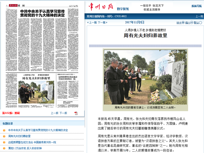 人得多情人不老 多情到老情更好 周有光夫妇归葬故里 本报讯 昨天早晨,周有光、张允和夫妇骨灰落葬我市栖凤山名人园。周有光的孙女周和庆等亲属和市领导蒋自平、方国强、卢明康出席了随后举行的周有光夫妇墓前雕像揭幕仪式。 周有光是从常州青果巷走出的杰出语言文字学家、经济学教授、汉语拼音方案的主要制订者,被誉为“汉语拼音之父”。其夫人张允和是当代著名昆曲研究家、著名的“合肥四姊妹”之一。她与周有光相濡以沫、举案齐眉70年,二人的爱情故事成为一段佳话。 今年1月14日,周有光在北京逝世,享年112岁;张允和于2002年离世,享年94岁。在家乡人民的深切期待中,在周有光家属的帮助下,10月26日,周和庆带着两位老人的骨灰回到青果巷。 周有光夫妇的墓前雕像,依据二人合照,以线刻工艺呈现于花岗岩石碑之上。石碑高1.73米、宽1.07米、厚18厘米。夫妇像下的“人得多情人不老 多情到老情更好”描摹自夫妇二人的亲笔手书,前半句由周有光书写,后半句由张允和书写——那年周老93岁、张老89岁。据周有光回忆,这句诗原由张允和献给俞平伯伉俪贺寿。 方国强在致辞中感谢周和庆及其家人将周有光的书籍、生前起居陈设等捐献给常州。他表示,常州将大力推动高校、机构以及社会民间力量,加强对周有光的生平、学术、思想等各方面的研究,形成一批研究成果,让更多的人了解周有光,认识周有光,学习周有光,纪念周有光。 2015年,常州大学成立周有光语言文化学院。 据悉,周有光图书馆、周有光纪念馆也将在周有光故居——青果巷礼和堂建成开放。 仪式上,常州大学周有光语言文化学院的学生代表用诗朗诵形式向他们的终生名誉院长致敬;周和庆代表家人向市委、市政府及相关方面表示谢意,并向市委统战部、市文广新局、民政局、常州大学、中国剪报社、栖凤山国际人文陵园赠送了《周有光文集》。 教育部语言文字应用研究所、中国语文现代化学会、中国语文报刊学会、中国剪报社和我市相关方面负责人共60余人出席揭幕仪式。(统轩 黄钰/文 张海韵/摄) 常州日报原文地址:http://epaper.cz001.com.cn/site1/czrb/html/2017-11/03/content_157091.htm 中国常州网转载地址:http://news.cz001.com.cn/2017-11/02/content_3388621.htm (编辑 包海霞) |