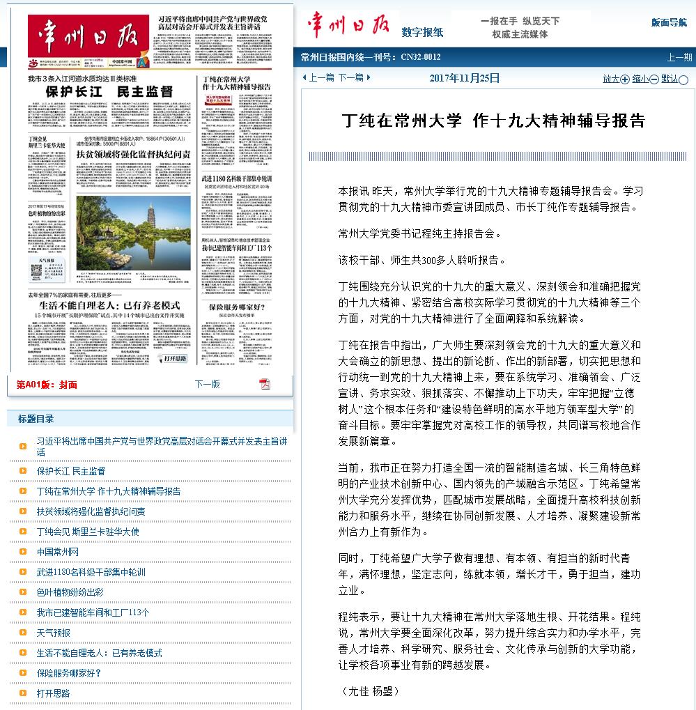 | 常州日报:丁纯在常州大学 作十九大精神辅导报告 |