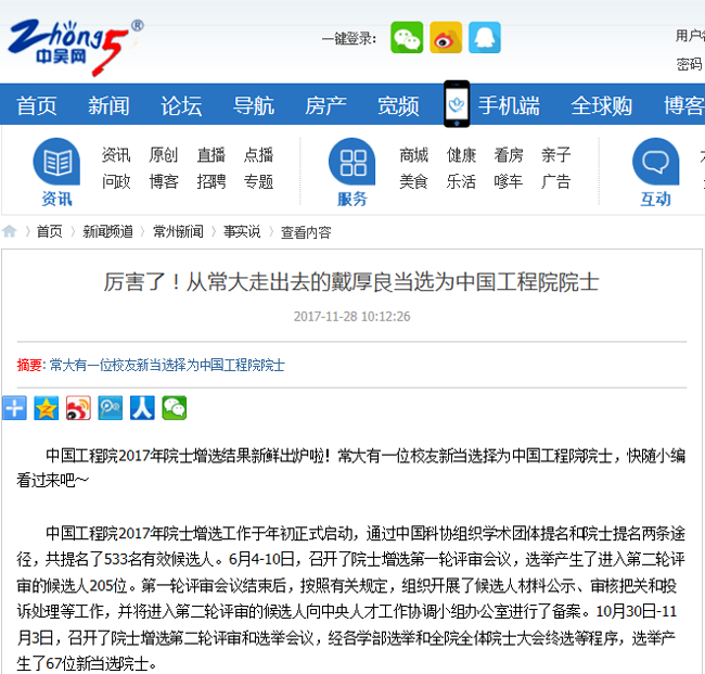 | 中吴网:厉害了!从常大走出去的戴厚良当选为中国工程院院士 |
