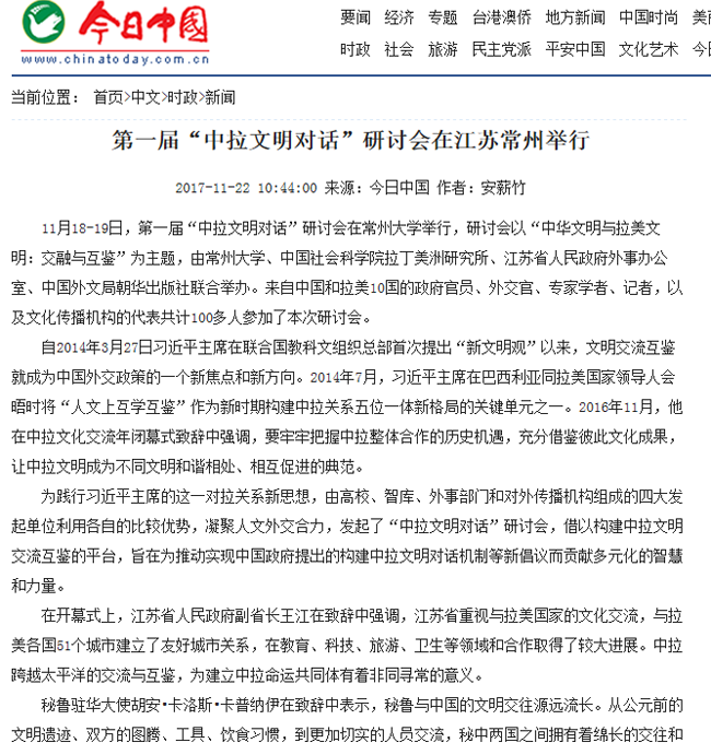 | 今日中国:第一届“中拉文明对话”研讨会在江苏常州举行 |
