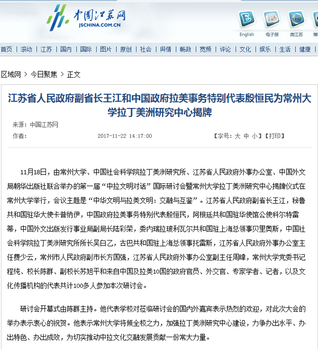 | 中国江苏网:江苏省人民政府副省长王江和中国政府拉美事务特别代表殷恒民为常州大学拉丁美洲研究中心揭牌 |