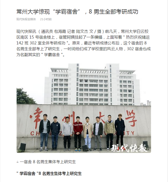 | 现代快报全媒体:常州大学现“学霸宿舍”!8男生全部考研成功 腾讯新闻、头条校园转载 |