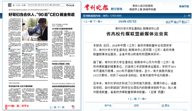 | 常州晚报:常州大学大学生通讯社·新媒体中心获省高校传媒联盟新媒体运营奖 |
