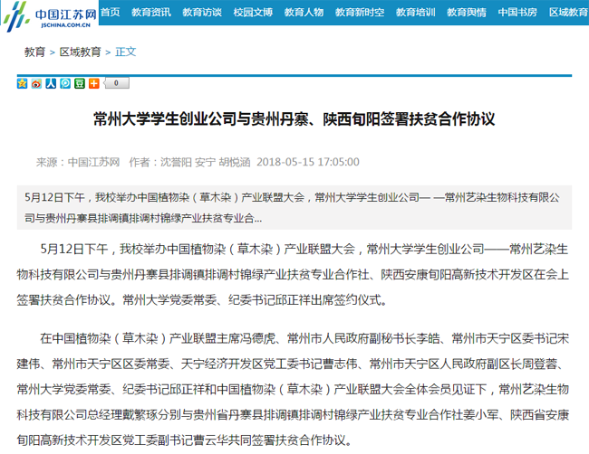 | 中国江苏网:常州大学学生创业公司与贵州丹寨、陕西旬阳签署扶贫合作协议 |