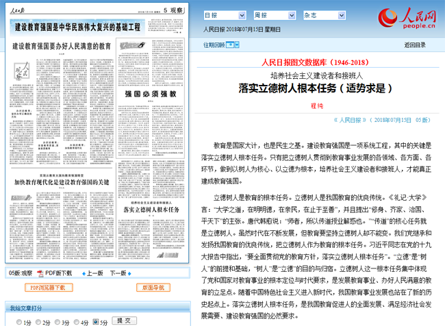 7月15日,人民日报第5版刊登我校党委书记程纯的署名文章“培养社会主义建设者和接班人 落实立德树人根本任务”,文章从立德树人是教育的根本任务、增强立德树人的使命意识、牢牢抓住立德树人的关键等三个方面阐释了只有把立德树人贯彻到教育事业发展的各领域、各方面、各环节,做到以树人为核心、以立德为根本,培养社会主义建设者和接班人,才能真正建成教育强国的观点。
