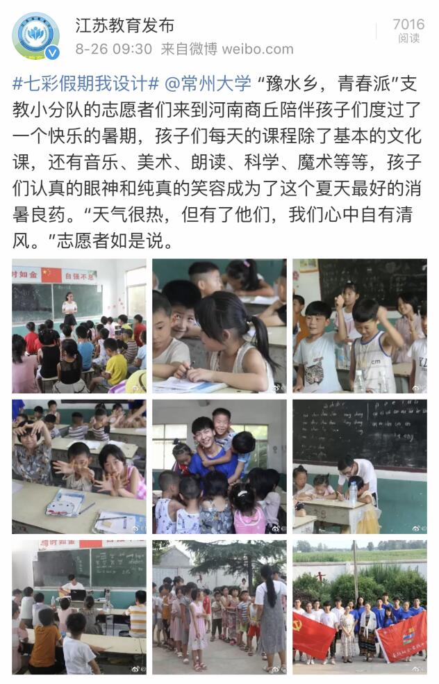 | 江苏教育发布(微博):#七彩假期我设计#@常州大学 “豫水乡,青春派”支教小分队 |