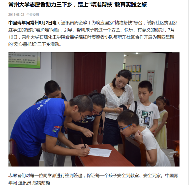 | 中青网:常州大学志愿者助力三下乡,踏上“精准帮扶”教育实践之旅 |