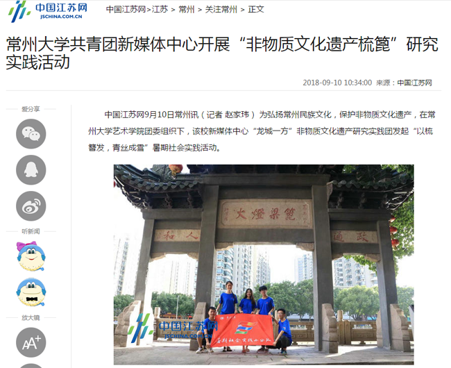 | 中国江苏网:常州大学共青团新媒体中心开展“非物质文化遗产梳篦”研究实践活动 |