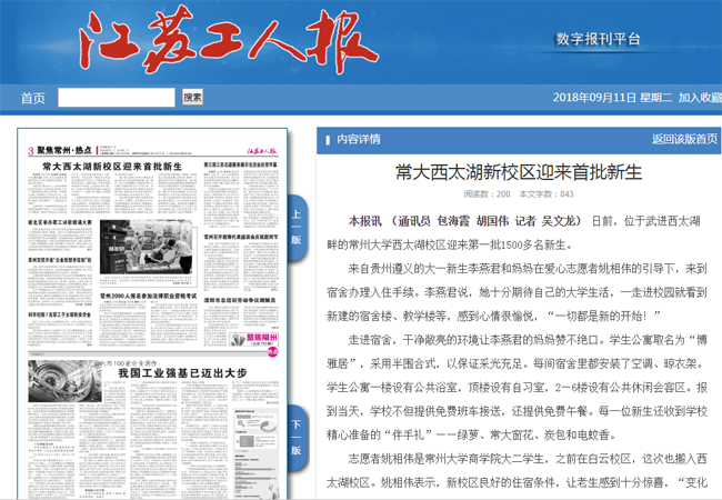 | 江苏工人报:常大西太湖新校区迎来首批新生 |