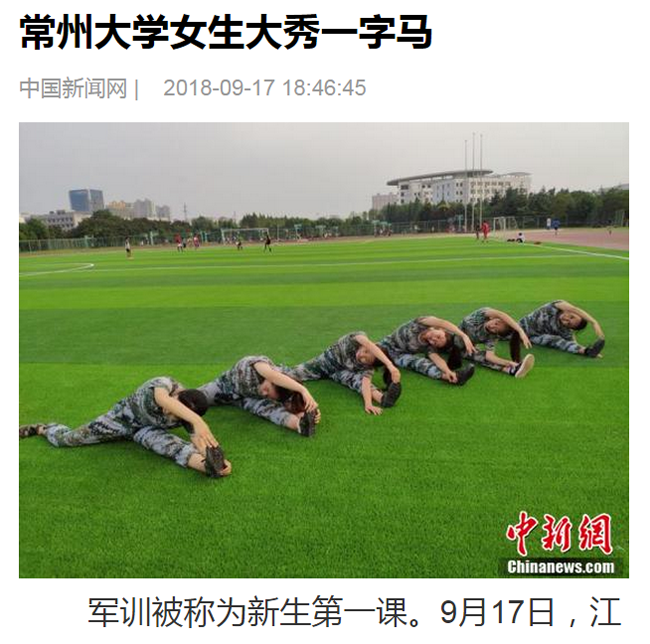 军训被称为新生第一课。9月17日,江苏常州大学一群女生在军训场上大秀一字马等高难度动作,为军训生活添上一道靓丽的色彩。