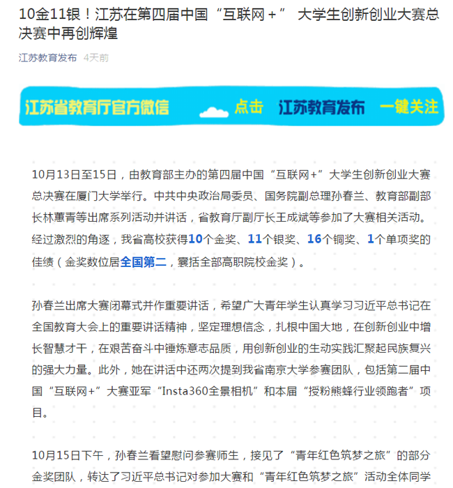 | 江苏教育发布:10金11银!江苏在第四届中国“互联网+” 大学生创新创业大赛总决赛中再创辉煌 |