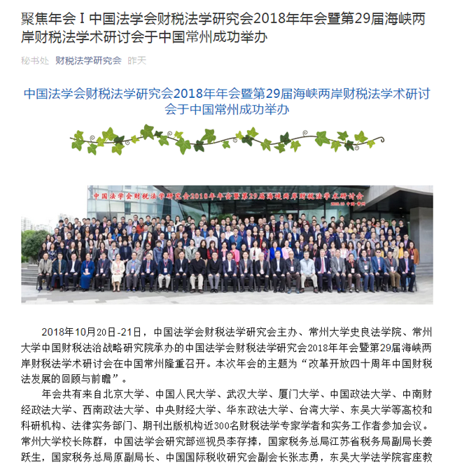 | 财税法学研究会公众号:中国法学会财税法学研究会2018年年会暨第29届海峡两岸财税法学术研讨会于中国常州成功举办 |