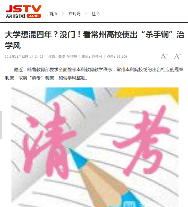 | 荔枝网:大学想混四年?没门!看常州高校使出“杀手锏”治学风 |