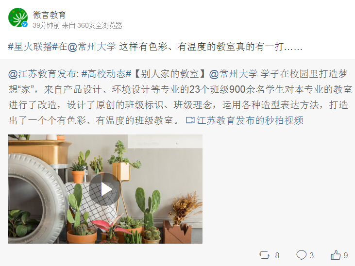 #星火联播#在@常州大学 这样有色彩、有温度的教室真的有一打…… @江苏教育发布: #高校动态#【别人家的教室】@常州大学 学子在校园里打造梦想“家”,来自产品设计、环境设计等专业的23个班级900余名学生对本专业的教室进行了改造,设计了原创的班级标识、班级理念,运用各种造型表达方法,打造出了一个个有色彩、有温度的班级教室。 江苏教育发布的秒拍视频