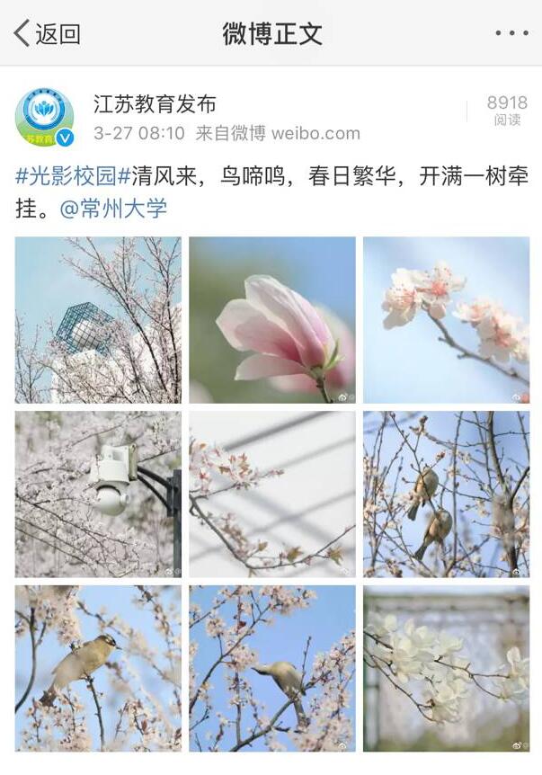 | 江苏教育发布(微博):#光影校园#清风来,鸟啼鸣,春日繁华,开满一树牵挂 |