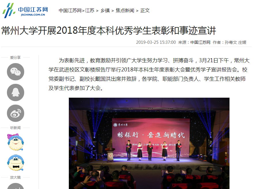 | 中国江苏网:常州大学开展2018年度本科优秀学生表彰和事迹宣讲 |
