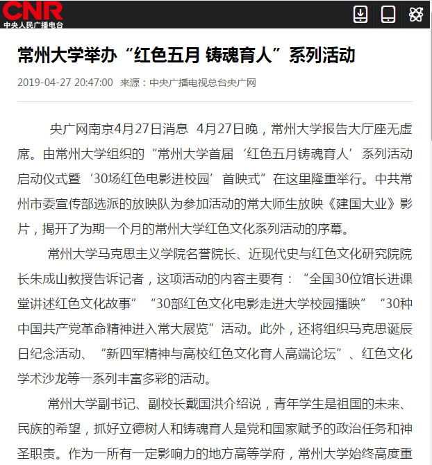 | 中央广播电视总台央广网:常州大学举办“红色五月 铸魂育人”系列活动 |