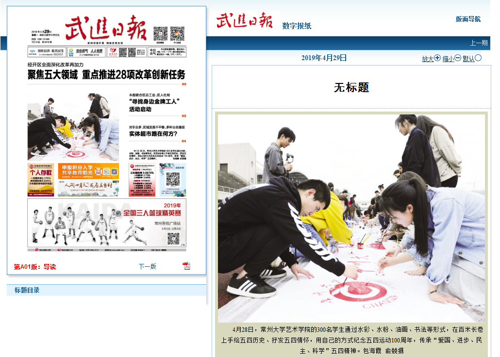 | 武进日报封面头条报道我校艺术学子百米长卷绘“五四”活动 |