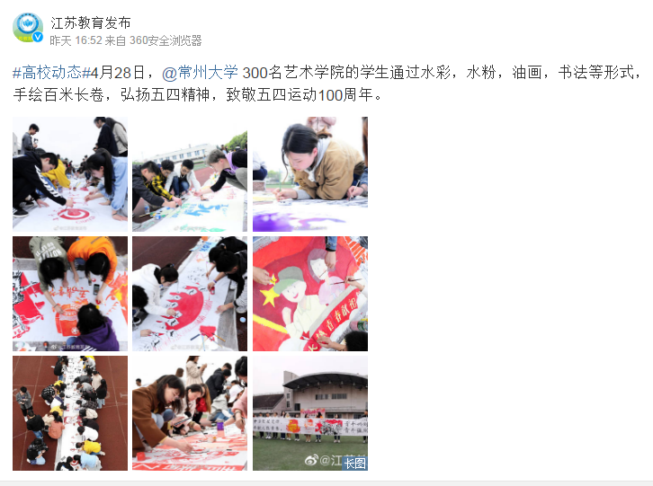 | 江苏教育发布(微博)报道我校艺术学子百米长卷绘“五四”活动 |