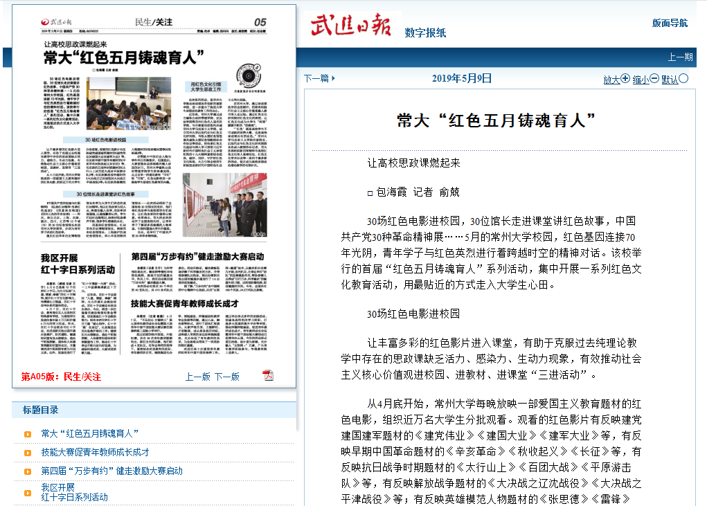 | 武进日报:常大“红色五月铸魂育人”让高校思政课燃起来 |