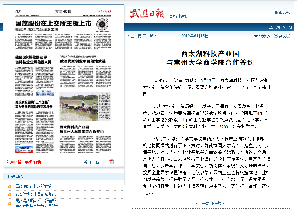 | 武进日报:西太湖科技产业园与常州大学商学院合作签约 |