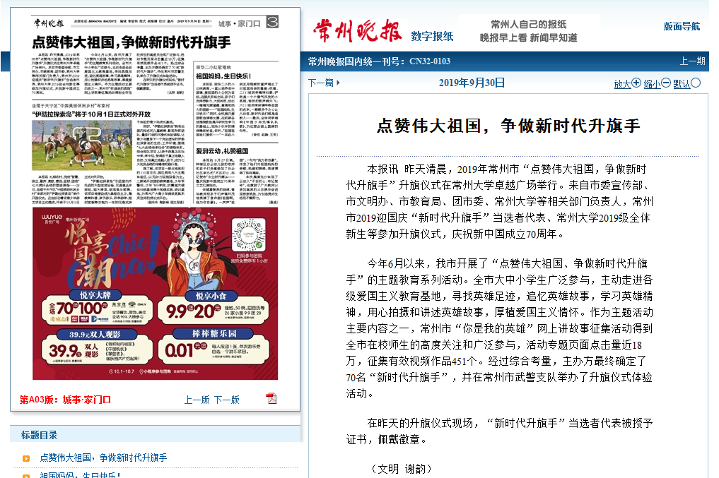 | 常州晚报:点赞伟大祖国,争做新时代升旗手 |