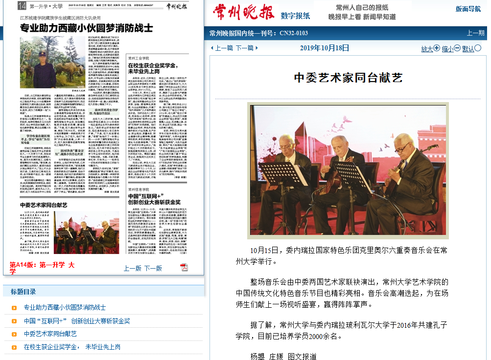 10月15日,委内瑞拉国家特色乐团克里奥尔六重奏音乐会在常州大学举行。 整场音乐会由中委两国艺术家联袂演出,常州大学艺术学院的中国传统文化特色音乐节目也精彩亮相。音乐会高潮迭起,为在场师生们献上一场视听盛宴,赢得阵阵掌声。 据了解,常州大学与委内瑞拉玻利瓦尔大学于2016年共建孔子学院,目前已培养学员2000余名。杨曌 庄媛 图文报道