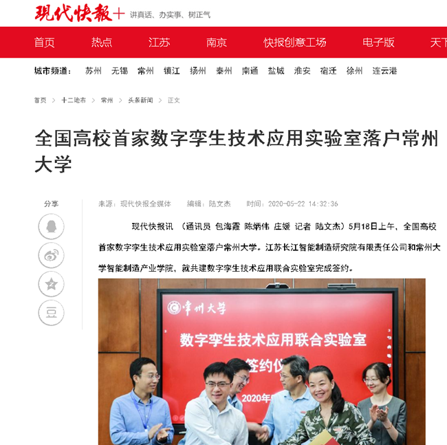 | 现代快报:全国高校首家数字孪生技术应用实验室落户常州大学 |