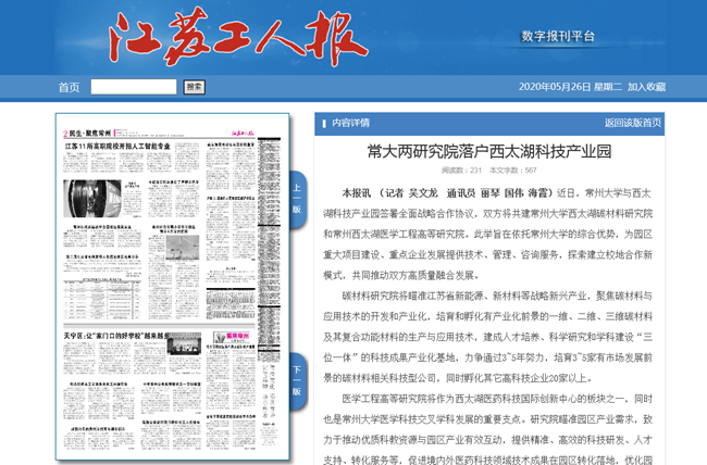 | 江苏工人报:常大两研究院落户西太湖科技产业园 |