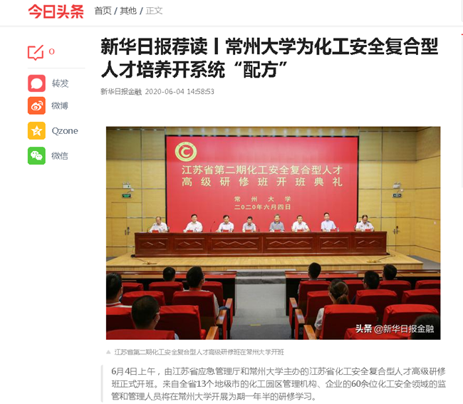 | 今日头条:新华日报荐读丨常州大学为化工安全复合型人才培养开系统“配方” |