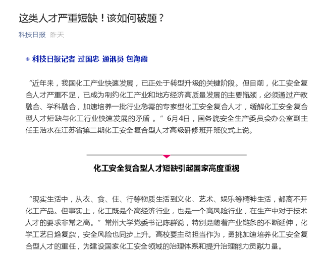 “近年来,我国化工产业快速发展,已正处于转型升级的关键阶段。但目前,化工安全复合人才严重不足,已成为制约化工产业和地方经济高质量发展的主要瓶颈,必须通过产教融合、学科融合,加速培养一批行业急需的专家型化工安全复合人才,缓解化工安全复合型人才短缺与化工行业快速发展的矛盾 。”6月4日,国务院安全生产委员会办公室副主任王浩水在江苏省第二期化工安全复合型人才高级研修班开班仪式上说。 化工安全复合型人才短缺引起国家高度重视 “现实生活中,从衣、食、住、行等物质生活到文化、艺术、娱乐等精神生活,都离不开化工产品。但事实上,化工既是个高经济行业,也是一个高风险行业,在生产中对于技术人才的要求非常之高。”常州大学党委书记陈群说,特别是随着产业链条的不断延伸,化学工艺日趋复杂,安全风险也同步上升。高校要主动担当作为,勇挑加速培养化工安全复合型人才的重任,为建设国家化工安全领域的治理体系和提升治理能力贡献力量。 “我国化工产业体量大,中大企业多,从业人员整体素质偏低,致使危险化学品在生产、机械与设备检修,以及危险化学品运输等安全保障工作难以落实到位。”王浩水说,从国内多起事故分析来看,最大的问题,是人的问题,缺乏懂得化工专业知识和安全防范事故的复合人才。特别是随着化工产业自动化程度越来越高,也对操作工人提出了更高的要求。操作工人技能素质高了,就能在化工生产过程中及时发现问题和事故风险。 江苏省应急管理厅副厅长李维新介绍,江苏是全国经济强省,也是化工大省。省内三分之二的化工企业集中在沿江沿海各城市,总体上形成具有集群效应的产业带,江苏化工行业在全省国民经济中取得了突出表现。去年的响水“3·21”特别重大爆炸事故,更警示我们,要以科学态度把握化工安全生产的规律和特点,以系统思维强化化工安全生产的方法和手段,以务实精神推进化工安全生产的实践和创新。 去年以来,江苏针对化工产业存在的问题,开展了集中的整治,已取得阶段性成效,后续整治攻坚任务依然艰巨繁重,人才短缺尤其是化工安全复合型人才短缺与化工行业快速发展的矛盾依然突出。在此情况下,开展化工安全复合人才培训工作,十分必要和紧迫。 在常州大学校长蒋军成看来,我国化工产业事故的时有发生和化工安全复合人才的严重不足,是由多方面因素造成的。过去,一方面,一些地方政府和企业,注重扩大规模与产能,忽视化工安全的保障性投入;另一方面,产业发展与化工安全专业人才培养脱节,难以支撑化工产业和经济高质量发展。 记者了解到,这些问题,已引起国家和地方的高度重视。去年,教育部新增了15个化工安全方面的专业。一些相关高校同样发挥学科优势和整合资源,通过课程改革与多学科融合,积极培养化工安全复合型人才。 “三结合”加快培养安全防控的复合型人才 常州大学安全科学与工程学科,是江苏省重点学科,拥有应急管理部油气储运安全技术创新中心、江苏省环境与安全工程中心、江苏省环境与安全实训教学示范中心等省部级科研与教学平台。近年来,学校成立了公共安全与应急管理研究院,进一步加强安全学科的建设与培育,安全工程专业也入选了国家一流本科专业。 去年,在教育部高等学校化工类专业教学指导委员会、江苏省化学化工学会的支持下,发起成立了中国化工安全教育联盟,吸纳了全国100多家协会、企业和高校等单位加盟,着力在化工人才培养过程中强化安全教育, 培养出一支安全理念先进、专业基础扎实、专业技术精湛、管理业务精通的高素质化工安全专家型人才队伍,以带动整个行业安全管理水平的提升, 以更好地适应新时代化工行业的发展趋势。 如何加快培养既懂专业知识,又懂安全防控的复合型人才?今年,为深入贯彻落实中共中央办公厅、国务院办公厅《关于全面加强危险化学品安全生产工作的意见》以及《教育部、国家安全监管总局关于加强化工安全人才培养工作的指导意见》和《江苏省危险化学品安全综合治理方案的通知》要求,为进一步加强化工行业人才强安工作,江苏省通过政府、高校、化工专业园区“三结合”的方式,在常州大学举办江苏省第二期化工安全复合型人才高级研修班。 蒋军成介绍,安全复合型人才高级研修班学员来自国内化工专业园区和化工重点企业,基本学习年限为1.5年,其中第一年为脱产学习,总学分最低修满26学分专业必修课、专业选修课和必修环节,后半年在企业进行生产实践并完成毕业论文。 尤其在培养课程体系上,课程体系将以化工安全为基础,包含安全生产法律法规、安全学原理、系统安全工程、风险评估理论与控制技术等必修课,消防工程、化工过程与工艺安全、化工机械与设备安全、化工安全管理信息化系统、安全检测技术等选修课,以及国内、省内的安全领域知名专家与领导关于安全监管与执法能力提升、安全管理与监管信息化建设、应急救援预案与应急管理、化工企业安全管理及安全标准化建设等专题讲座。 “我们先行先试,对课程进修系统整合,让学员通过全面系统的理论学习与生产实践,熟悉国家安全生产领域方针、政策和法规,具备扎实的化工专业基础知识和工程实践能力,掌握现代化工安全工程和管理的理论、方法,具备较强的发现问
