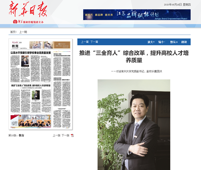| 新华日报:推进“三全育人”综合改革,提升高校人才培养质量——对话常州大学党委副书记、副校长戴国洪 |