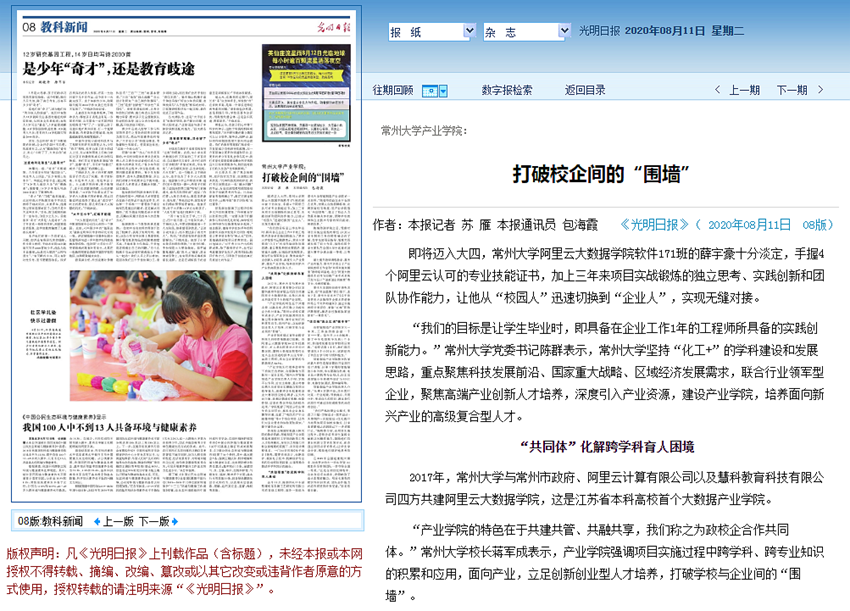 8月11日,光明日报以‘打破校企间的“围墙”’为题,从“共同体”化解跨学科育人困境、“共创思维”夯实跨学科育人基础、“项目制”真正实现“做中学”三个方面报道我校深入推进产教融合,产业学院办学成效突显。