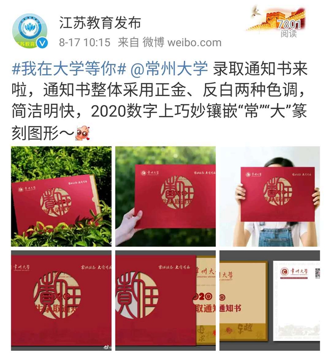 #我在大学等你# @常州大学 录取通知书来啦,通知书整体采用正金、反白两种色调,简洁明快,2020数字上巧妙镶嵌“常”“大”篆刻图形~ 江苏教育发布(微博):https://m.weibo.cn/3674007143/4538853660823120 |