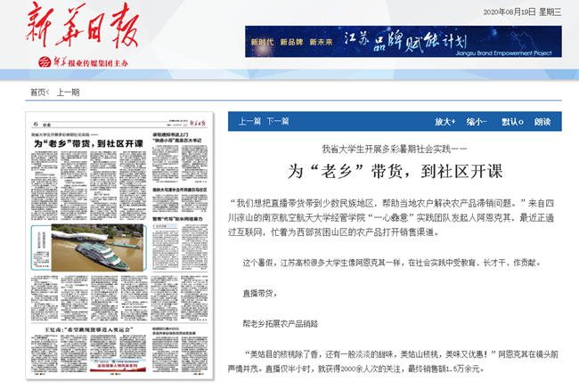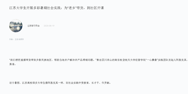 | 新华日报、学习强国:我省大学生开展多彩暑期社会实践——为“老乡”带货,到社区开课 |