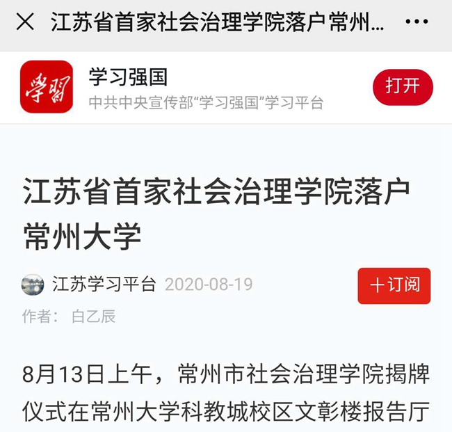 | 学习强国:江苏省首家社会治理学院落户常州大学 |