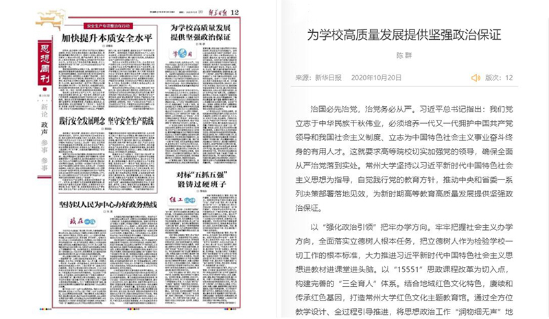 10月20日,新华日报“思想周刊”以“为学校高质量发展提供坚强政治保证”为题发表我校党委书记陈群的署名文章。文章从“以‘强化政治引领’把牢办学方向”“以‘坚定政治信仰’筑牢思想根基”“以‘聚焦政治能力’配强干部队伍”“以‘净化政治生态’实现政治清明”四个方面详细阐述了常州大学坚持以习近平新时代中国特色社会主义思想为指导,自觉践行党的教育方针,推动中央和省委一系列决策部署落地见效,为新时期高等教育高质量发展提供坚强政治保证的探索实践。具体内容如下: